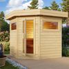 Met de Azalp Buitensauna Katsoa haal je een moderne buitensauna in je tuin die comfort en stijl perfect samenbrengt. De constructie van vurenhout met 45 mm dikke wanden zorgt voor goed warmtebehoud, met de mogelijkheid om te kiezen voor dikkere wanden voor extra isolatie. Twee ramen en de deur met veel glas zorgen voor veel natuurlijke lichtinval. Dankzij het slimme hoekontwerp past de Katsoa perfect in een hoek van de tuin, waardoor je optimaal gebruik maakt van de beschikbare ruimte. Een ideale keuze voor wie buiten wil ontspannen in eigen tuin.