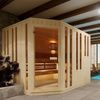 Met de Nurkka sauna haal je een sfeervolle hoeksauna in huis die dankzij het hoekontwerp efficiënt gebruikmaakt van de ruimte. Deze massieve Finse binnensauna van vurenhout heeft stevige wanden van 45 mm dik die zorgen voor een aangename warmte en een duurzame constructie. Het vele glas en de glazen deur zorgen voor veel lichtinval en geven de cabine een open, moderne uitstraling die perfect past in een eigentijds interieur. Zo combineert de Nurkka comfort, design en ruimtebesparing in één stijlvolle sauna.