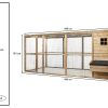 Houten dierenren met een afmeting van 448 x 179 x 183 cm. Het is mogelijk deze ren later nog uit te breiden met losse panelen. De ren is voorzien van een groot nachthok (met doorgang voor kippen of konijnen), een vast legnest, 19 x 19 x 1,45 mm gaas en gegalvaniseerd hang en sluitwerk. Deze houten dieren verblijven worden op afspraak in gemonteerde panelen bij jouw thuis geleverd. Met de handleiding die per e-mail naar je toe gestuurd wordt is het monteren een fluitje van een cent.