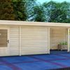 Tuinhuis Berlijn is het grootste tuinhuis van de serie en heeft een afmeting van 500x300 cm. Dit tuinhuis is vervaardigd uit blank* Vurenhout. De Berlijn is te bestellen als los tuinhuis, maar kan ook gecombineerd worden met een luifel van 200, 300, 400 of 500 cm. Wil je graag een afgesloten overkapping creëren? Kies dan ook voor een achter- en/of zijwand! De zijwand is 300 cm en past daarbij bij iedere maat luifel. De achterwand is 200 cm, kies daarom bij grotere maten luifels voor twee of meer achterwanden.
