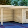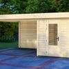 Tuinhuis Bremen is het kleinste tuinhuis van de serie en heeft een afmeting van 200x300 cm. Dit tuinhuis is vervaardigd uit blank* Vurenhout. De Bremen is te bestellen als los tuinhuis, maar kan ook gecombineerd worden met een luifel van 200, 300, 400 of 500 cm. Wil je graag een afgesloten overkapping creëren? Kies dan ook voor een achter- en/of zijwand! De zijwand is 300 cm en past daarbij bij iedere maat luifel. De achterwand is 200 cm, kies daarom bij grotere maten luifels voor twee of meer achterwanden.