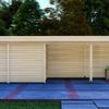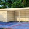 Tuinhuis Hamburg heeft een afmeting van 400x300 cm. Dit tuinhuis is vervaardigd uit blank* Vurenhout. De Hamburg is te bestellen als los tuinhuis, maar kan ook gecombineerd worden met een luifel van 200, 300, 400 of 500 cm. Wil je graag een afgesloten overkapping creëren? Kies dan ook voor een achter- en/of zijwand! De zijwand is 300 cm en past daarbij bij iedere maat luifel. De achterwand is 200 cm, kies daarom bij grotere maten luifels voor twee of meer achterwanden.