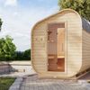 De Karibu Asymmetrische barrelsauna onderscheidt zich door zijn unieke uitstraling, dankzij de afgeronde hoeken en het asymmetrische design, wat hem tot een opvallende en stijlvolle toevoeging aan jouw tuin maakt. Met vier comfortabele banken biedt deze ruime sauna plaats aan vier personen. De sauna is daarnaast uitgerust met een handige voorruimte, waar je je kunt omkleden en afkoelen zonder direct de hitte te verlaten. De glazen deur laat extra natuurlijk licht binnen, waardoor de binnenruimte helder en uitnodigend aanvoelt.