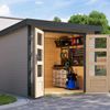 De Jupiter serie van Karibu is een uniek tuinhuis waarbij het hout en metaal combineert. Dit zorgt voor een moderne look en feel. Het tuinhuis heeft een platdak en een wanddikte van 19mm waardoor het ideaal is om als opslag van tuingereedschap, fietsen of als klusruimte te gebruiken.