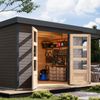De Jupiter serie van Karibu is een uniek tuinhuis waarbij het hout en metaal combineert. Dit zorgt voor een moderne look en feel. Het tuinhuis heeft een platdak en een wanddikte van 19mm waardoor het ideaal is om als opslag van tuingereedschap, fietsen of als klusruimte te gebruiken.