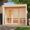 De Karibu Angkor buitensauna is een moderne sauna, voorzien van een klein overdekt terras met een stijlvolle lamellenwand voor extra beschutting. De volledige voorkant, inclusief de enkele deur, is van glas, wat zorgt voor maximaal natuurlijk licht. De lamellenwand biedt daarbij precies de juiste balans tussen lichtinval en privacy, zodat je ongestoord kunt ontspannen. Met drie banken biedt deze sauna plaats aan maximaal 4 personen, waardoor het een perfecte plek is om in alle rust te genieten.