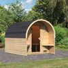 De Karibu buitensauna heeft een klassieke ronde vorm die niet alleen een visueel hoogtepunt in je tuin creëert, maar ook een unieke sfeer binnenin biedt. Dankzij de bijzondere boogdakconstructie en de halve barrelsauna-stijl, met vlakke wanden, geniet je van meer binnenruimte in vergelijking met traditionele barrelsauna's. Deze sauna is uitgerust met drie comfortabele banken en biedt plaats aan maximaal vier personen. De glazen deur laat veel natuurlijk licht binnen, terwijl de kleine overkapping zorgt voor extra beschutting. Het dak is beschikbaar in zowel zwart als rood, zodat je de sauna perfect kunt afstemmen op je persoonlijke stijl.