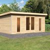 De Karibu Mainburg buitensauna is een schitterende sauna met een L-vormige voorruimte voor extra comfort. De voorruimte biedt niet alleen ruimte om je om te kleden en af te koelen, maar is groot genoeg om te functioneren als tuinhuisje. Deze sauna is uitgerust met twee banken en biedt ruimte aan maximaal 3 personen. Dit model heeft een lessenaars dak en dubbele openslaande deuren met glas, die samen met de twee grote glazen ramen zorgen voor veel natuurlijk licht en een mooi uitzicht.