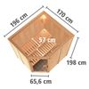 De Karibu Siirin is een binnensauna met twee banken, geschikt voor drie personen. Het ontwerp heeft een glazen deur die in de hoek is geplaatst, waardoor deze hoek wordt afgevlakt en een rechte kant krijgt door de deur. Dit unieke ontwerp zorgt voor een moderne uitstraling en maakt optimaal gebruik van de ruimte.