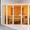 De Karibu Asta infraroodsauna is een ruime, driehoekige sauna met drie comfortabele banken, geschikt voor maar liefst vijf personen. De volledige voorkant, inclusief de deur, is van glas, wat zorgt voor een naadloze integratie met de rest van de ruimte, ook laat dit een overvloed aan natuurlijk licht binnen. Deze sauna is bovendien een infrarood combi-sauna, wat een unieke eigenschap is die extra voordelen biedt, zoals snellere opwarming en gerichte warmte voor een diepere ontspanning. Hierdoor combineert de Asta het beste van traditionele en infrarood sauna-ervaringen.