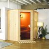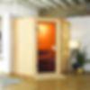 De Karibu Taurin is een kleine binnensauna met twee banken, geschikt voor twee personen. Het ontwerp heeft een glazen deur die in de hoek is geplaatst, waardoor deze hoek wordt afgevlakt en een rechte kant krijgt door de deur. Dit unieke ontwerp zorgt voor een moderne uitstraling en maakt optimaal gebruik van de ruimte.