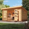 De Trittau serie van Karibu bestaat uit grote en moderne blokhutten met een lessenaarsdak en een stevige houtstapelbouw constructie. Met een wanddikte van 38mm is deze blokhut ideaal voor het opbergen van tuinspullen of als klusruimte. Combineer het gemak van een berging met de ontspanning van een overkapping door de Trittau te bestellen met overkapping. Zo kun je het hele jaar door ontspannen in je tuin.