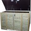 Fietsenberging met de fietsen geplaatst in de rij-richting. Deze berging is volledig geventileerd en heeft een opklapbaar watervast dakdeel gemaakt van betonplex. Het dak loopt licht af en het dakdeel beweegt heel makkelijk door zijn 2 stevige gasveren. De bovenzijde en deursluiting zijn fraai en netjes afgewerkt met een aluminium rand.
