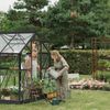 Tuinkas Mary van Royal Well is een elegante kas die niet alleen genoeg ruimte biedt om te kweken, maar ook om te ontspannen. Dit model met puntdak en schuifdeur met haakslot combineert functionaliteit met stijl. Het 3 mm dikke veiligheidsglas wordt bevestigd met dempend foamtape aan de binnenzijde en PVC beglazingstrips aan de buitenzijde, die eenvoudig te installeren zijn en naadloos aansluiten bij de kleur van de profielen. De meegeleverde, stevige fundering zorgt voor een stabiele basis, geschikt voor zowel onverharde als verharde ondergronden.