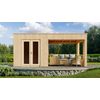 Een moderne blokhut inclusief veranda, zo kan de nieuwe Werner genoemd worden. Met een strak vormgegeven design bestaande uit een plat dak en verticaal te monteren planken is deze blokhut uniek te noemen. Tevens wordt er echt glas gebruikt voor deze blokhut.