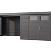 De Classico met lounge van Telluria is een luxe metalen tuinhuis. Het tuinhuis is ideaal voor het opbergen van gereedschap, fietsen of om er een klusruimte van te maken. De ruime overkapping zorgt voor de ideale plek om onder te ontspannen en zo heel het jaar door van je tuin te genieten. De twee vaste ramen in de overkapping zorgen voor extra lichtinval en een meer open gevoel.