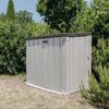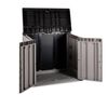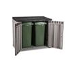 Dankzij de royale inhoud van 842 liter biedt de box voldoende ruimte voor twee containers van 120 liter, maar ook voor grotere tuinspullen zoals een barbecue of grasmaaier. De box is vervaardigd uit stevig kunststof met een houtnerfstructuur, wat zorgt voor een onderhoudsvrije en weerbestendige constructie die jarenlang meegaat. Het deksel opent soepel via een duwmechanisme en blijft moeiteloos openstaan dankzij de geïntegreerde hydraulische gasveren. De dubbele deuren aan de voorkant maken het mogelijk om grotere items eenvoudig in en uit te laden.