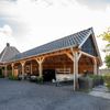 De hoeve XL carport met schuur is een traditioneel en stijlvol carport met opbergruimte. Het gebruik van slanke palen van 14.5 x 14.5 cm en de toepassing van getoogde schoren krijgt de overkapping een rustieke, landelijke uitstraling. De lage achterzijde creëert een intieme sfeer, terwijl de hoge voorzijde juist een gevoel van ruimte creëert.