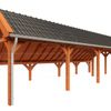 De Kapschuur de Hoeve XL van Trendhout is een stijlvol buitenverblijf met slanke palen van 14.5 x 14.5 cm. Dankzij de toepassing van getoogde schoren krijgt de overkapping een rustieke, landelijke uitstraling. De lage achterzijde creëert een intieme sfeer, terwijl de hoge voorzijde juist een gevoel van ruimte creëert. De kapschuur is verkrijgbaar in meerdere breedtes en een diepte van 3 of 4 meter.
