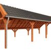 De Kapschuur de Hoeve XL van Trendhout is een stijlvol buitenverblijf met slanke palen van 14.5 x 14.5 cm. Dankzij de toepassing van getoogde schoren krijgt de overkapping een rustieke, landelijke uitstraling. De lage achterzijde creëert een intieme sfeer, terwijl de hoge voorzijde juist een gevoel van ruimte creëert. De kapschuur is verkrijgbaar in meerdere breedtes en een diepte van 3 of 4 meter.
