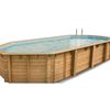De houten constructie is de basis van het zwembad en is gemaakt van hogedruk geïmpregneerd sparrenhout (vuren) afkomstig uit de koude streken van Noord-Europa. Door de lage temperaturen groeien de bomen onder moeilijke omstandigheden en ontwikkelen ze een zeer fijne structuur waardoor het hout bestand is tegen veel weerstand en het ideaal is voor het grote gewicht van zwembadwater.