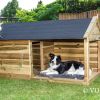 Dit mooie hondenhok geeft jou trouwe viervoeter een veilig beschut plekje. Dit mooie hok heeft een veranda om lekker op te liggen in het zonnetje en is daarbij voorzien van een beschut slaapplekje. Het dak is bedekt met dakleer, dit zorgt voor een goede waterafvoer. De punt in het dak zorgt voor een luxe uitstraling, perfect voor in jouw tuin!