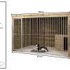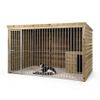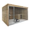 Deze hondenkennel geeft jou trouwe viervoeter een veilig beschut plekje waarbij duurzaamheid en eenvoudig onderhoud samenkomen in een luxe design. Het hok heeft een zijwanden en een voor- en achterwand hierdoor heeft jouw hond geen last van de elementen van het weer en kan hij rustig buiten genieten van de frisse lucht. Aan de voorkant zit een stevig kennelpaneel die beschikt over een deur zodat je makkelijk naar binnen kan. De spijlen zijn 16 mm dik en staan 8cm uit elkaar. Het afvoeren van water is gemakkelijk omdat het dak van de kennel afloopt en is bekleed met dakleer. In de kennel zit ook een nachthok, deze is voorzien van een watervaste betonplex bodem. De bodem houd de kou en het vocht tegen van de ondergrond zodat jouw hond een comfortabel plekje heeft om te schuilen.
