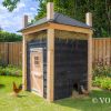 Dit verblijf is gemaakt van Zweeds rabat met een Douglas afwerking. Zweeds rabat zorgt ervoor dat de planken strak in elkaar vallen, wat niet alleen een mooie uitstraling geeft, maar ook regenwater effectief afvoert en het verblijf beter beschermt tegen vocht. Het Douglas hout biedt daarnaast natuurlijke weerstand tegen schimmels en insecten, waardoor het verblijf extra stevig en duurzaam is